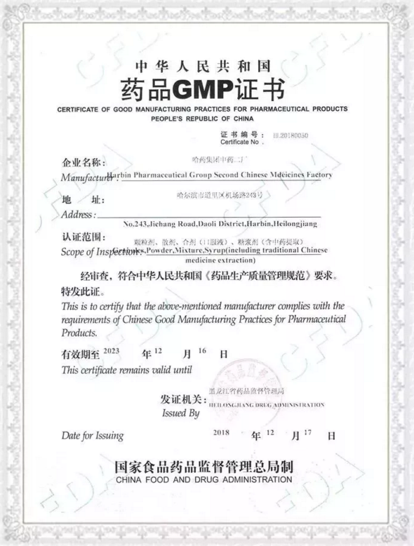经过三天考核验收,专家组在本次现场检查中未发现严重缺陷项目和主要缺陷项目,总体评价完全符合新版药品GMP要求,中药二厂顺利通过现场检查验收,并于2018年12月17日取得了黑龙江省食品药品监督管理局颁发的《药品GMP证书》,认证范围包括颗粒剂、散剂、合剂(口服液)、糖浆剂(含中药提取),证书有效期为2018年12月17日至2023年12月16日。